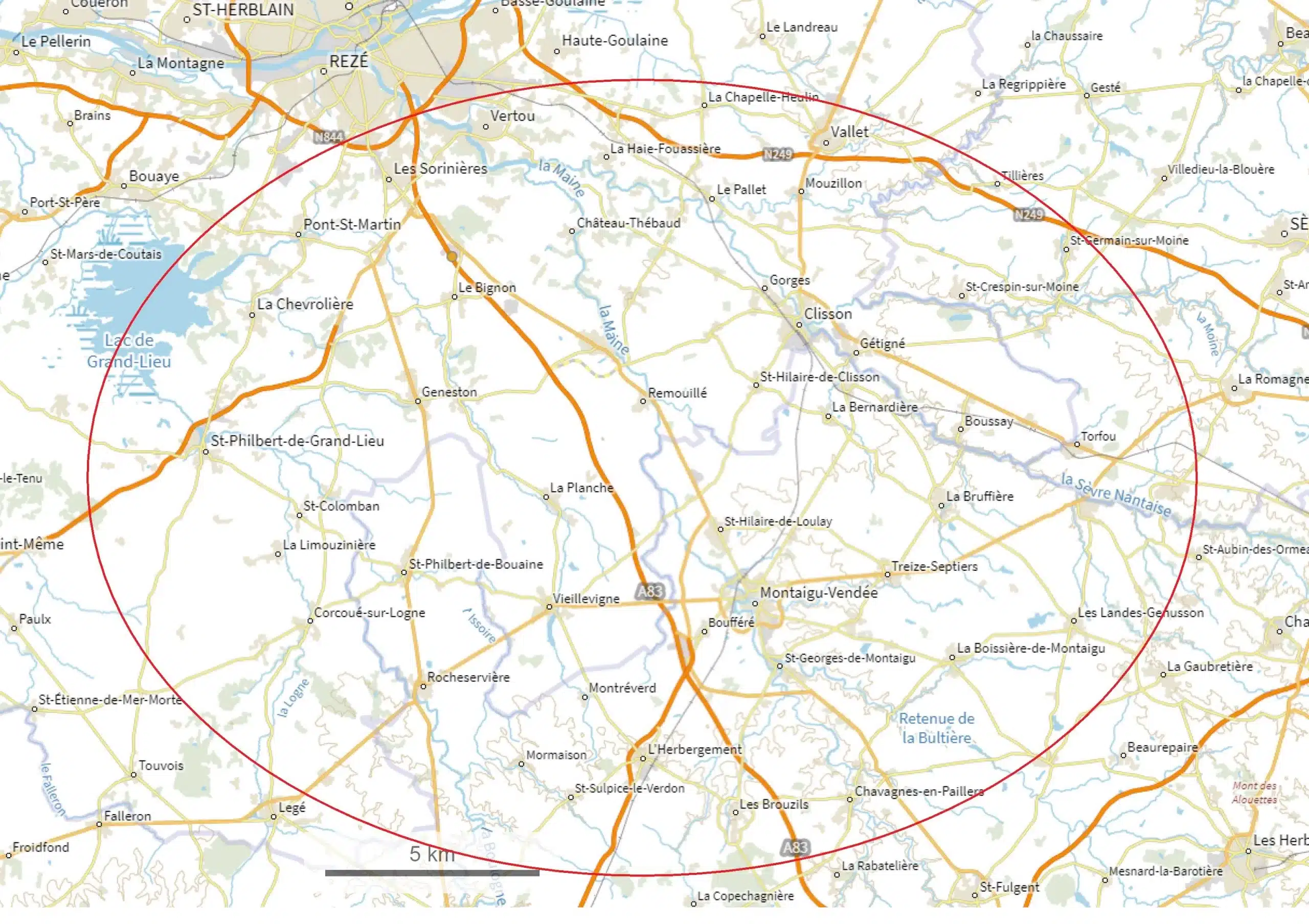 La Roche-sur-Yon – Vallet – Montaigu – Aigrefeuille-sur-Maine – Le Bignon – Saint-Philbert-de-Grand-Lieu – La Planche – Les Sorinières – La Haie-Fouassière – Legé – Remouillé – Vieillevigne – Boufféré – Chavagnes-en-Paillers – Saint-Philbert-de-Bouaine – Treize-Septiers – Tiffauges – Clisson – Vertou – Machecoul